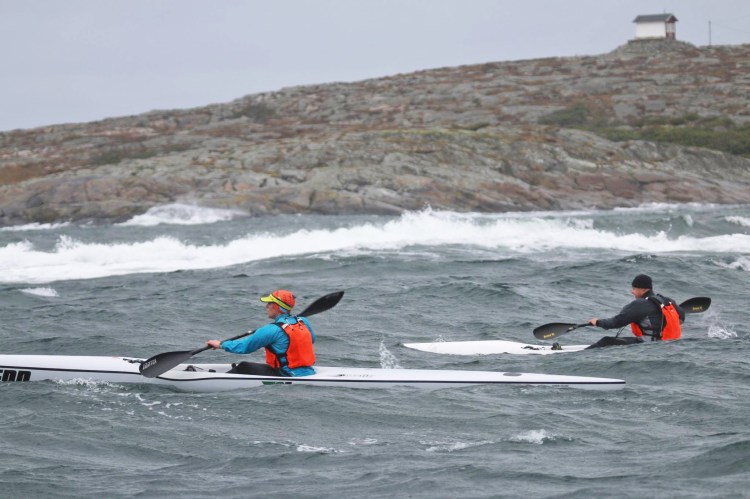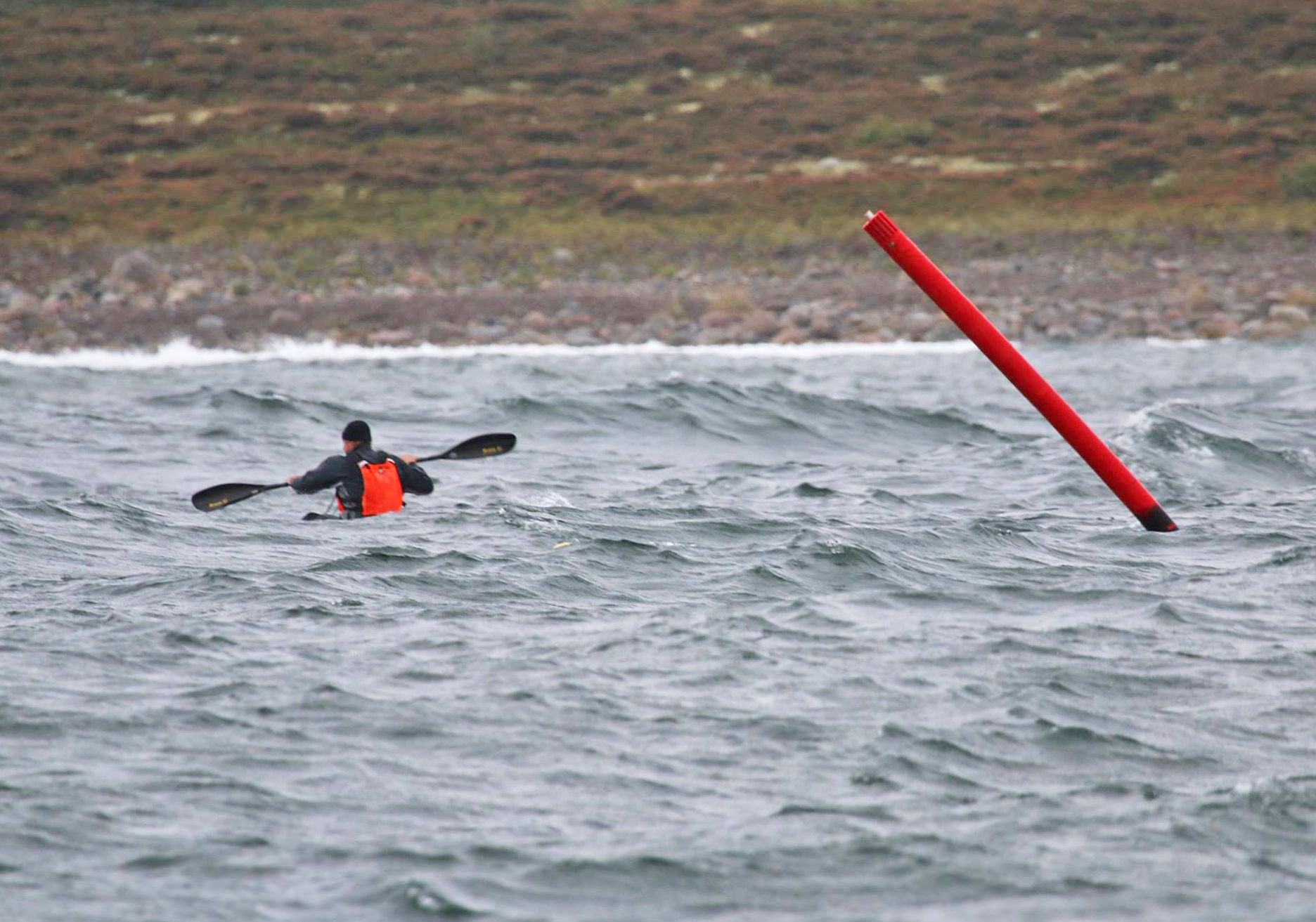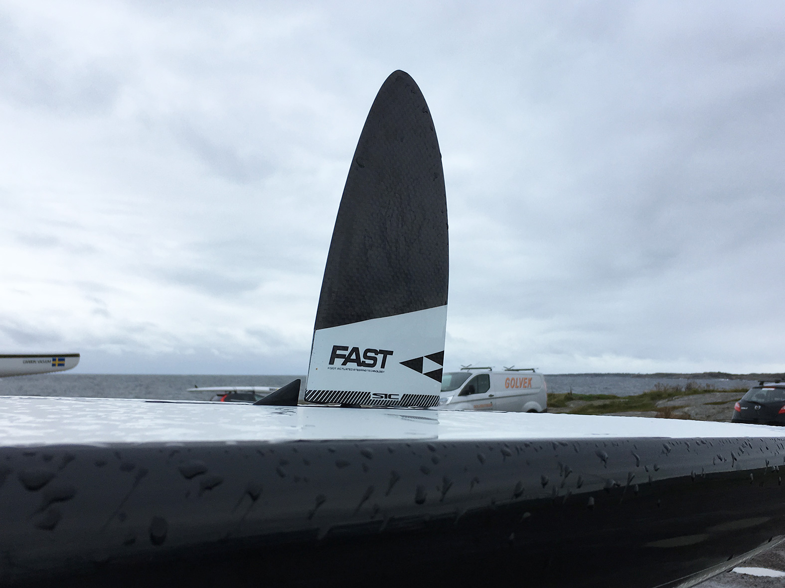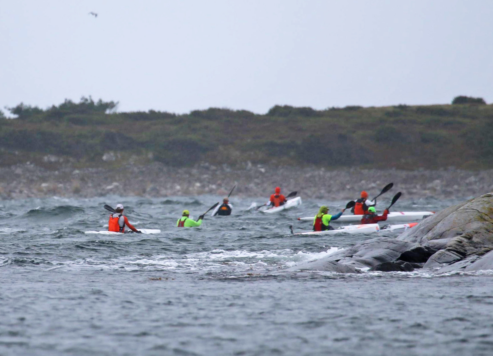 Paddlingen ut till Fjordskär bjöd i princip på rätvinklig sidvind, som dessutom ökade i styrka ju längre ut man kom. Detta i kombo med ökade sidovågor. Kortfattat så styr man rodret på SUP:en med en liten pedal med ena foten. I princip fick jag hålla rodret i maxläge och ändå kompensera med överdrivet många paddeltag på lä-sidan för att hålla linjen mot yttre skäret. Aldrig har sträckan Draget-Fjordskär känts så lång. Men, det gick fint. Vid rundningen av skäret, som i sig bjöd på viss dramatik då vissa av vågorna därute är av karaktären brytande surfvåg. Särskilt spännande för några av surfskipaddlarna som körde denna rutten.