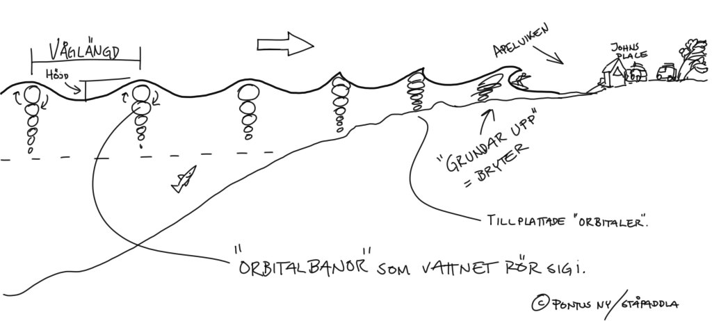 Om du inte är med på resonemanget, så gör vi ett par exempel. Först och främst kan du själv nästa gång du är ute prova att placera dig stillastående med brädan och se vad som händer. Gärna en dag med rejäla vågor.