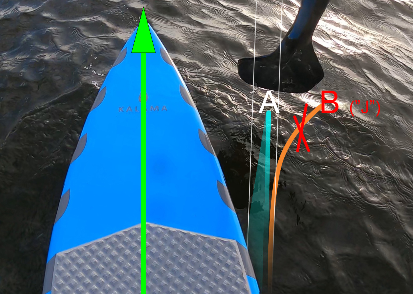 This means that the blade more effectively directs a force diagonally forward, which counteracts the board’s yaw / turn. (Newton’s third law: To every action there is always opposed an equal reaction. So, the force that the blade pushes against the water at a backward direction is equal to the force that the water in return pushes against the blade at your forward propulsion. Actioni contrariam semper et æqualem esse reactionem.)